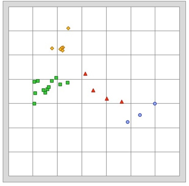 Задача многомерного шкалирования (multidimensional scaling, MDS) заключается в следующем - отобразить исходную выборку (таблицу объект-свойство - ТОС) в виде множества точек на плоскости (scatter plot). Плоское представление, как правило, искажено, но в целом отражает основные структурные особенности многомерной выборки, в частности, её кластерную структуру. Поэтому двумерное шкалирование часто используют как инструмент предварительного анализа и понимания данных, а также наглядной визуализации. Это позволяет значительно повысить удобство работы с многомерными данными. В качестве примера на рис.7 представлена кластерная структура выборки (экспериментальных данных - ТОС), по данным которой разрабатывалась компьютерная система дифференциальной диагностики заболеваний печени.